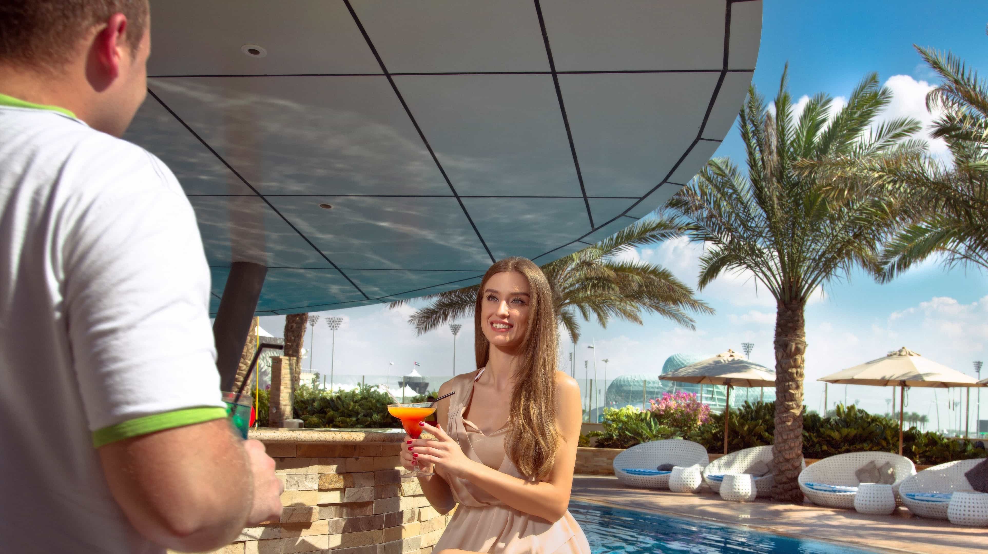 تتربّع استراحة أكواريوس بجانب حوض السباحة على سطح مبنى فندق بيرل روتانا وتقدّم وجبات خفيفة ومشروبات منعشة بينما تسترخ تحت أشعة الشمس.