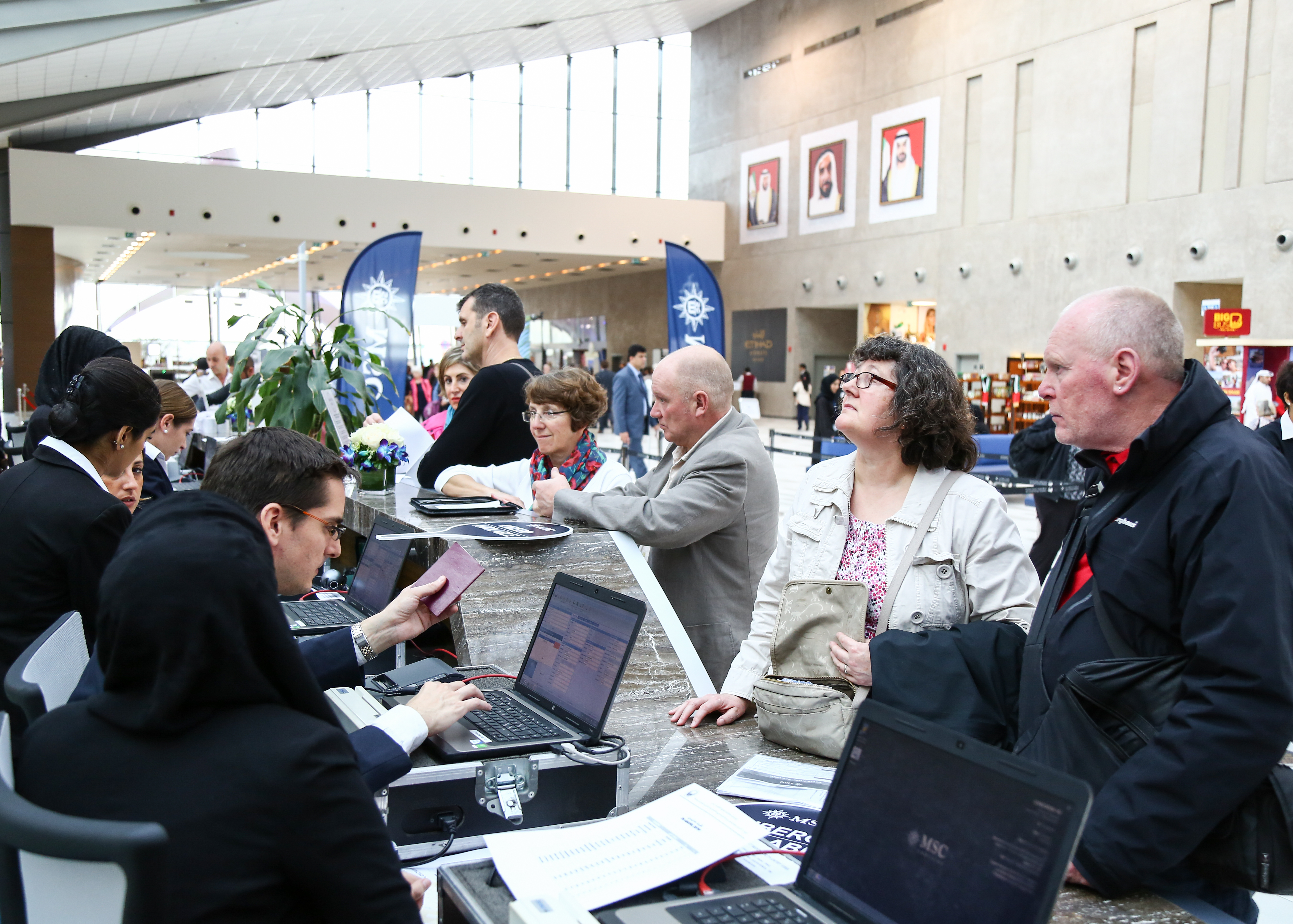 Passengers can often enjoy custom Arabic coffee, falconry demonstrations and henna painting on arrival, while a traditionally themed souk (market) and heritage area host lively activities for passengers and the general public. A regional first, the terminal includes Etihad Airways check-in counters, allowing disembarking passengers to deposit luggage and prepare for their journey onwards by plane.