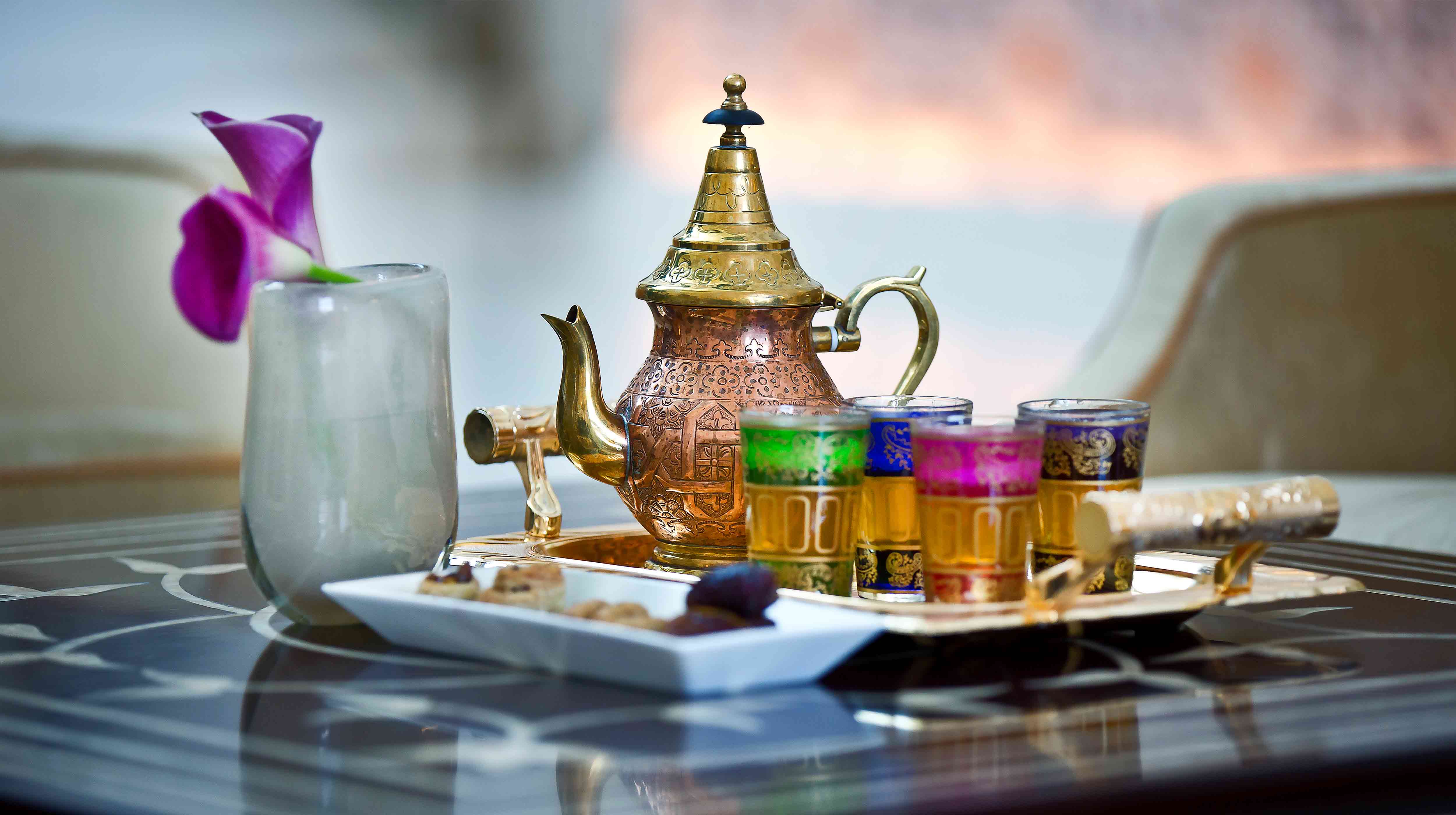 The ideal spot to admire Bab Al Qasr Hotel's grand lobby, Morjana Tea Lounge embodies Arabic elegance. The soothing water fountains, towering palm trees, calming piano tunes and smell of traditional Arabic Oud provide a tranquil retreat for guests.